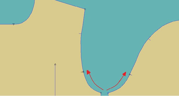 En la espalda, se pierde la pinza en la línea del centro. El inicio se deja a la altura de la sisa, la profundidad mayor de cintura se queda a la misma altura y se desvanece en la parte más alta de la cadera. Esto ayuda a formar la curvatura de la cintura y cadera.